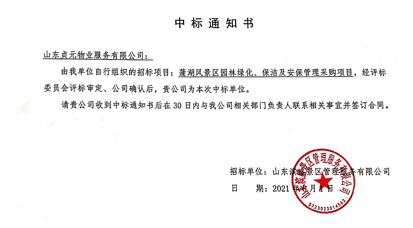 蒲湖風(fēng)景區(qū)園林綠化、保潔及安保項(xiàng)目中標(biāo)通知