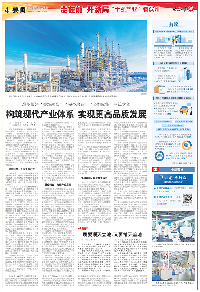 產(chǎn)業(yè)是區(qū)域經(jīng)濟發(fā)展的根基和支撐。濱州市扭住“十強產(chǎn)業(yè)”高質量發(fā)展的“牛鼻子”,凝心聚力抓發(fā)展、促轉型;堅持工業(yè)立市、實業(yè)強市不動搖,推進存量變革、增量崛起;做好“戰(zhàn)新轉型”“強企培育”“金融賦能”三篇文章,積極構建戰(zhàn)新產(chǎn)業(yè)引領、先進智造業(yè)支撐、金融服務業(yè)協(xié)同的現(xiàn)代產(chǎn)業(yè)體系。