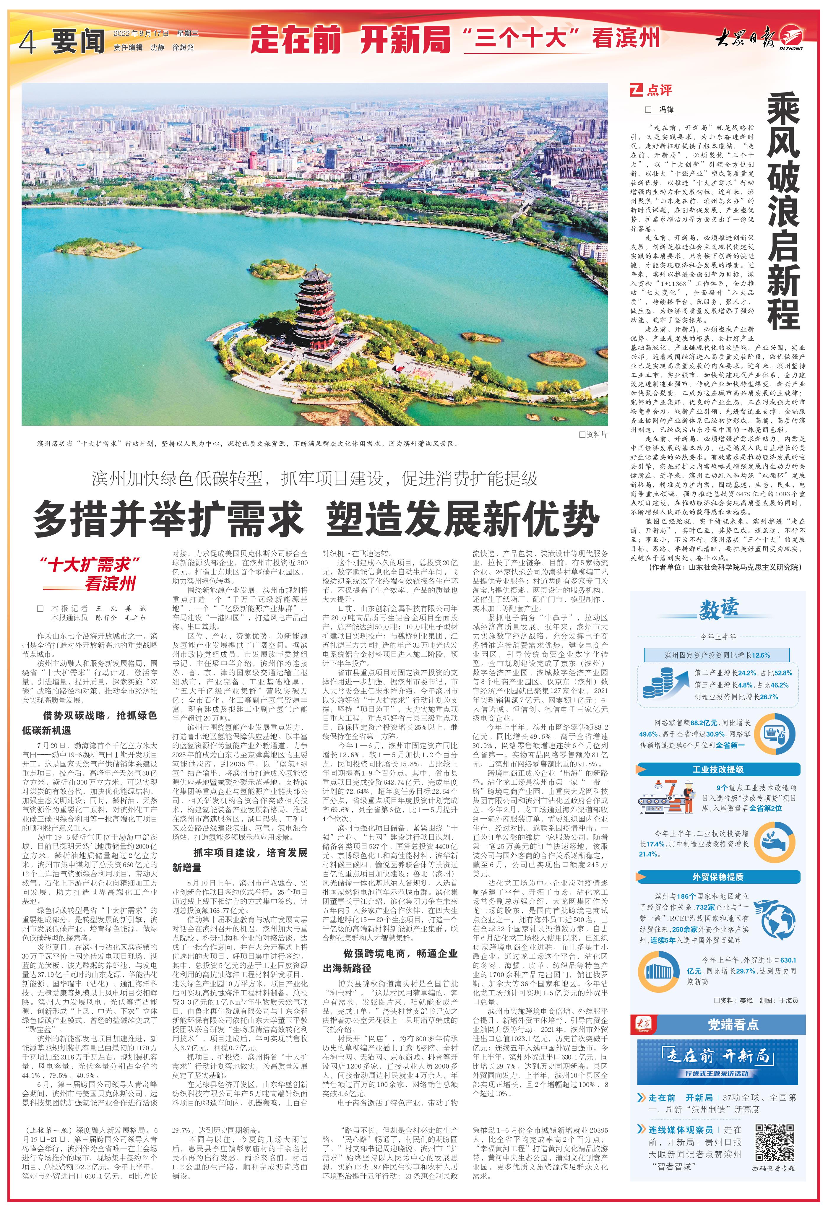 7月4日起,大眾日?qǐng)?bào)及客戶端等全媒體平臺(tái)推出“走在前 開新局”大型主題報(bào)道,記者深入16市基層一線調(diào)研采訪,集中展現(xiàn)各地貫徹落實(shí)習(xí)近平總書記對(duì)山東工作的重要指示要求,錨定“走在前、開新局”,推進(jìn)“三個(gè)十大”行動(dòng)的創(chuàng)新舉措、進(jìn)展成效,生動(dòng)講述各地砥礪奮進(jìn)、創(chuàng)新實(shí)干的鮮活事例,充分反映山東發(fā)展的新變化新氣象,以實(shí)際行動(dòng)迎接黨的二十大勝利召開。今天刊發(fā)第三十九組報(bào)道:“十大擴(kuò)需求”看濱州。
