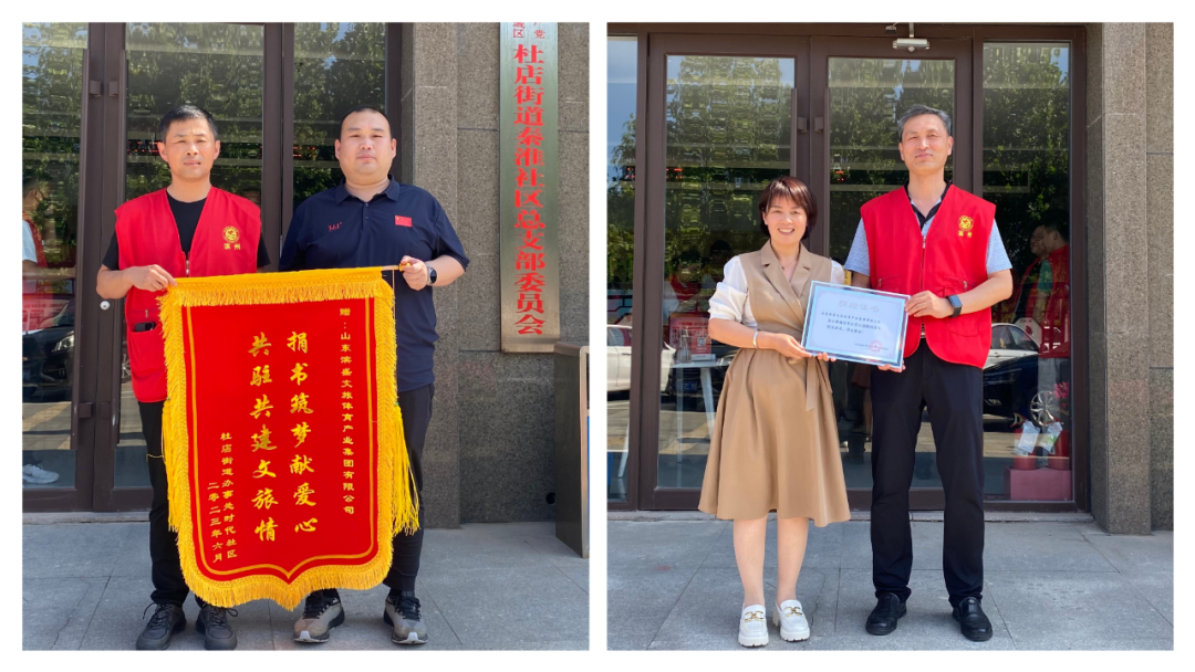 捐贈儀式上,杜店街道黨工委副書記、辦事處主任孫天樂向濱盛集團黨委副書記、董事王贊海送上“捐書筑夢獻愛心 共駐共建文旅情”錦旗,時代社區(qū)黨支部書記趙國美向濱盛集團黨委委員、紀委書記張汝生送上捐贈證書表示感謝。趙國美書記表示社區(qū)將管好用好這批圖書,引導居民多讀書、讀好書,切實豐富社區(qū)居民文化生活。