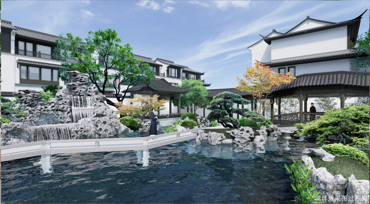 在園林設(shè)計(jì)上,項(xiàng)目借鑒以網(wǎng)師園為代表的蘇派園林精髓,合院部分采用中式傳統(tǒng)風(fēng)格,通過五進(jìn)制歸家動(dòng)線表達(dá)中式宅院的禮制空間概念。高層部分采用現(xiàn)代造園理念與手法,通過“一環(huán)·兩軸·五境”的概念,引入綠城“M-LIFE”景觀標(biāo)準(zhǔn)體系,營(yíng)造一處符合時(shí)代審美感官,并兼具生態(tài)與社會(huì)效益的綠色景園。