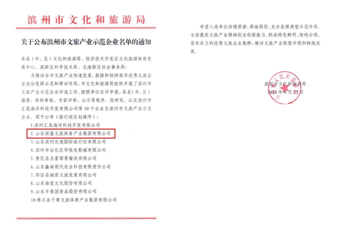 9月27日,濱州市文化和旅游局正式揭曉了濱州市文旅產(chǎn)業(yè)示范企業(yè)名單,其中,山東濱盛文旅體育產(chǎn)業(yè)集團(tuán)有限公司榮耀上榜。