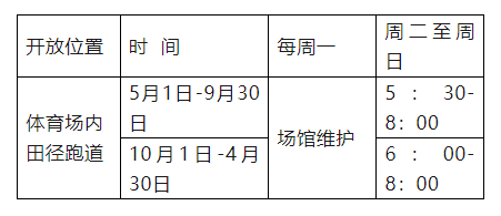 三、開放項目:體育場內的塑膠跑道,用于市民跑步及行走鍛煉,不得進行比賽、訓練、不得穿釘鞋、不得使用草坪等。